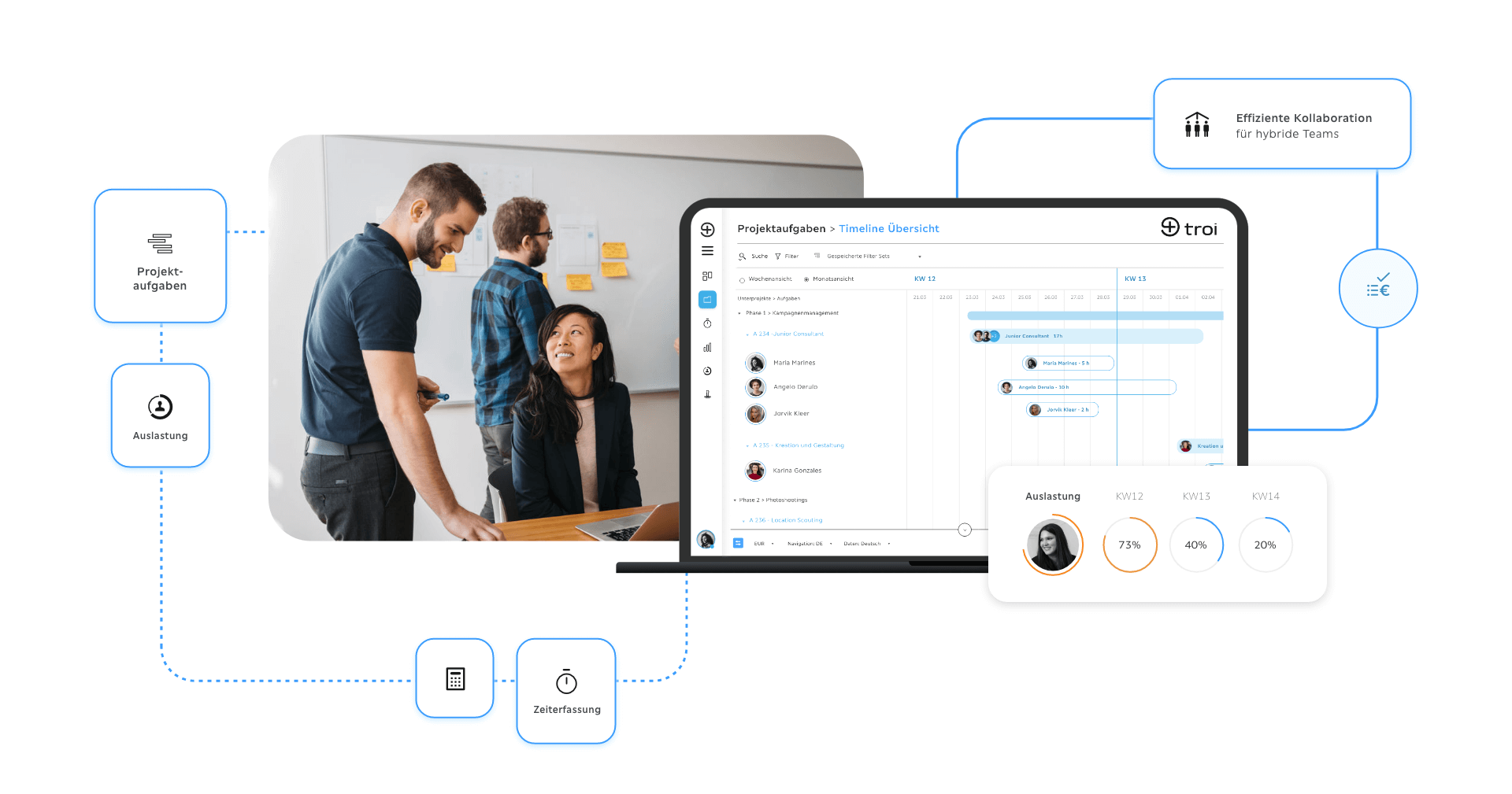 Troi verbindet Teams über Unternehmensbereiche und Standorte hinweg. Ideal für remote und hybride Teams. Ohne Systembrüche ermöglicht Troi einen effizienten Daten- und Informationsfluss. One Team – one Troi.