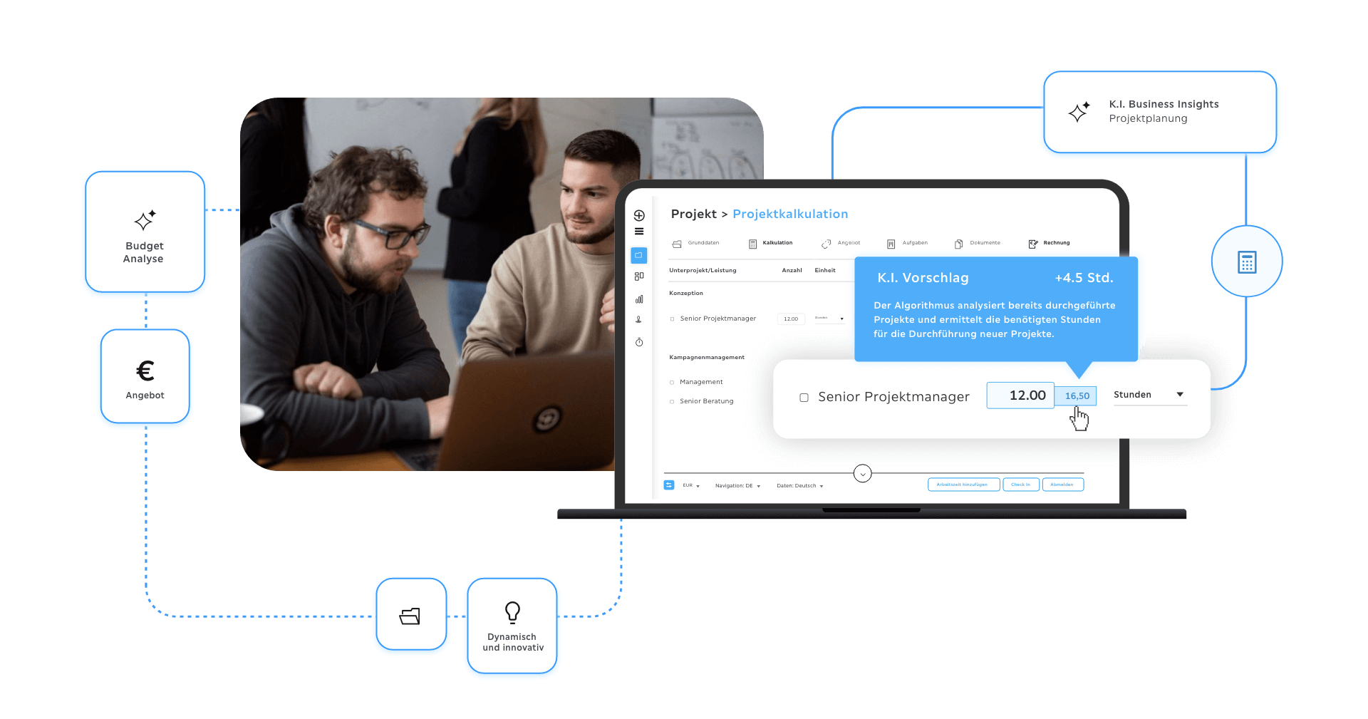 Mit Smart Calculation haben wir die erste K.I. Anwendung entwickelt, die eine präzise Aufwandsschätzungen für Projekte ermöglicht. Der Algorithmus analysiert bereits durchgeführte Projekte und ermittelt die benötigten Stunden für die Durchführung neuer Projekte.